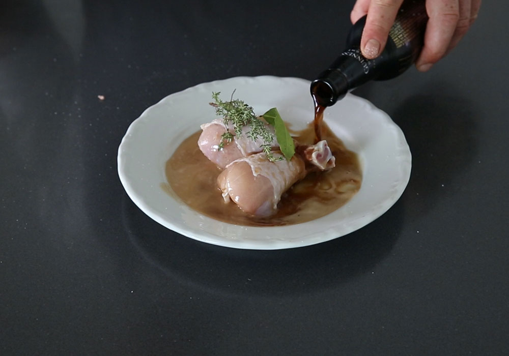 Per questa ricetta usiamo le cosce di pollo Monteverde (disossate e senza pelle) che mariniamo con birra, sale, pepe, timo e alloro. Lasciare riposare 30 minuti.