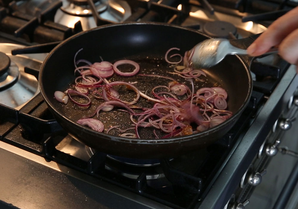 Nel frattempo, affettiamo le cipolle rosse a fettine sottili. Le facciamo caramellare con zucchero di canna, olio e un pizzico di sale finchè caramellate.