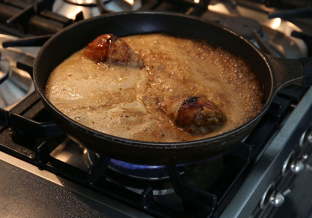 Dopo averle spostate, nella stessa padella, rosoliamo le cosce nell’olio rimasto; sfumiamo con la birra, copriamo e lasciamo cuocere per una ventina di minuti fino a cottura.