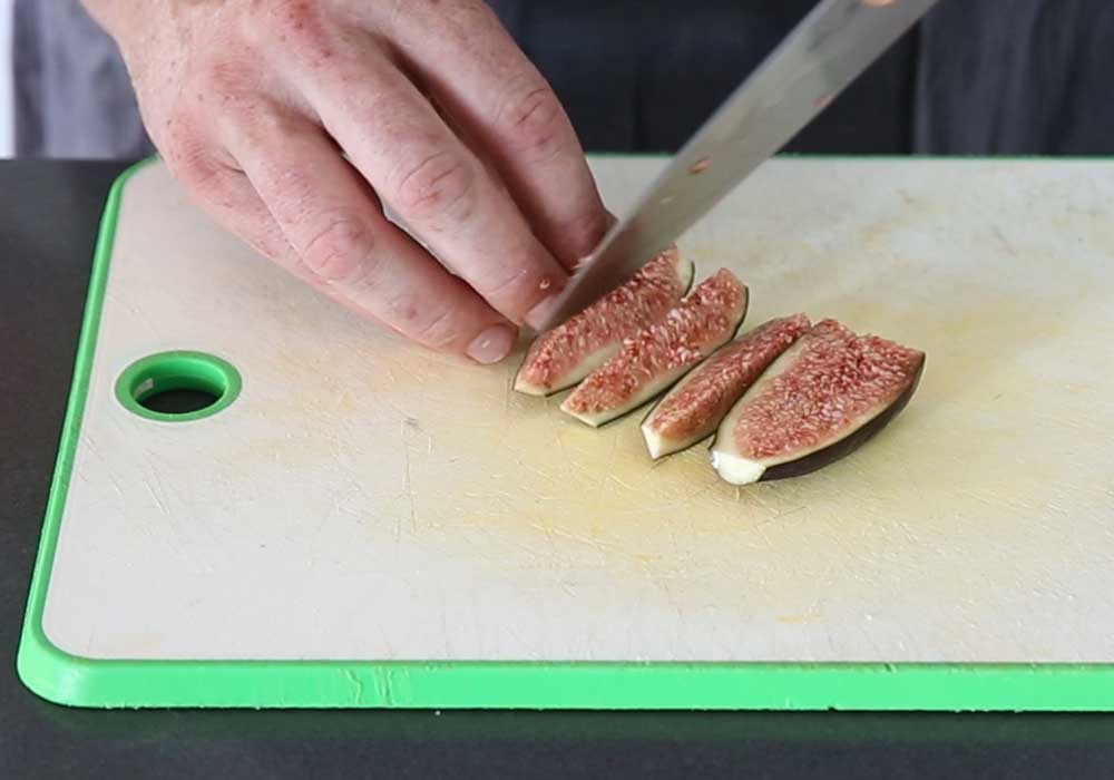 Nel frattempo prepariamo la rucola, tagliamo i fichi a spicchi e prepariamo le noci e le scaglie di Parmigiano.