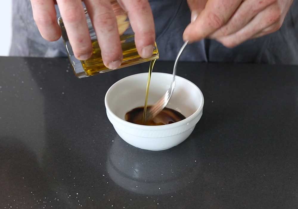Prepariamo la vinaigrette emulsionando olio, aceto balsamico, miele, sale e pepe in una ciotolina.