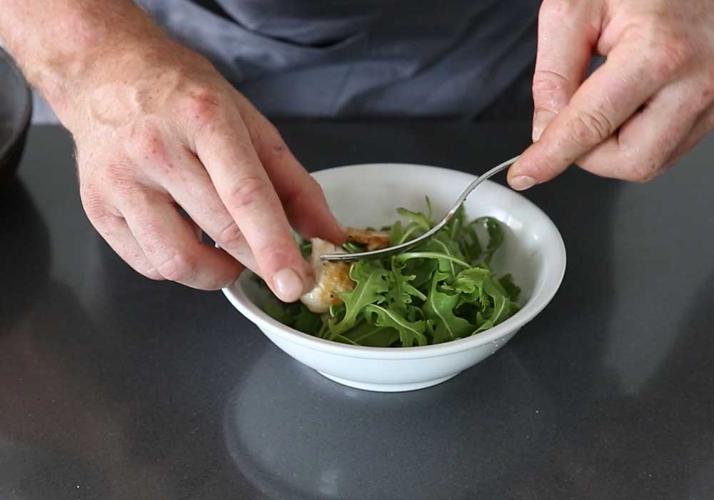 Per impiattare creiamo un letto di rucola dove andiamo ad adagiare il pollo, i fichi e le noci.
