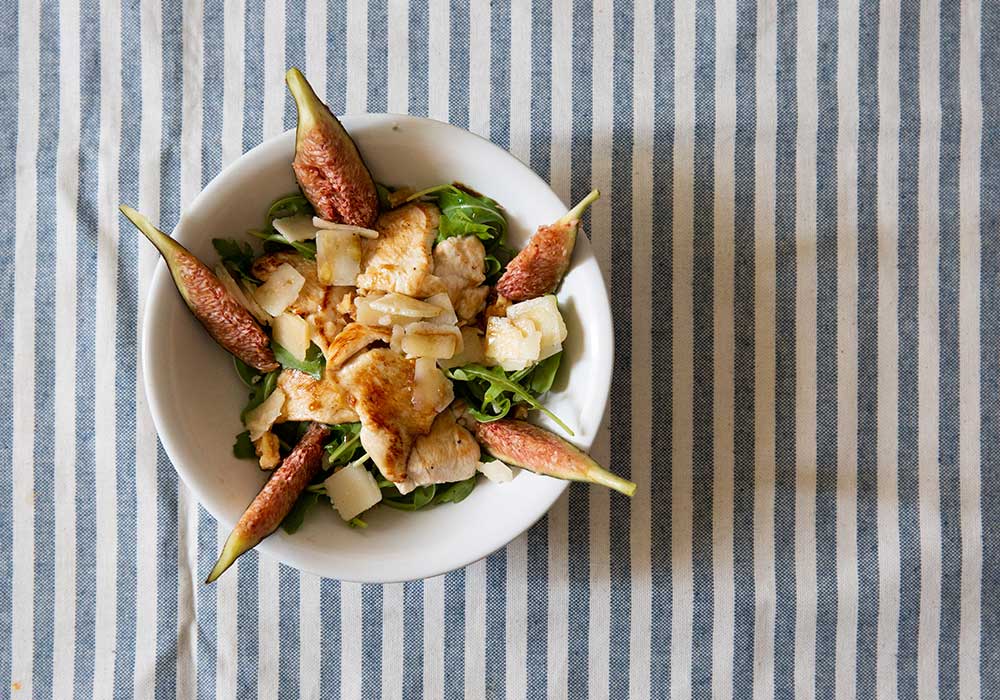 Insalata fresca di pollo marinato al miele con fichi, rucola, noci e grana