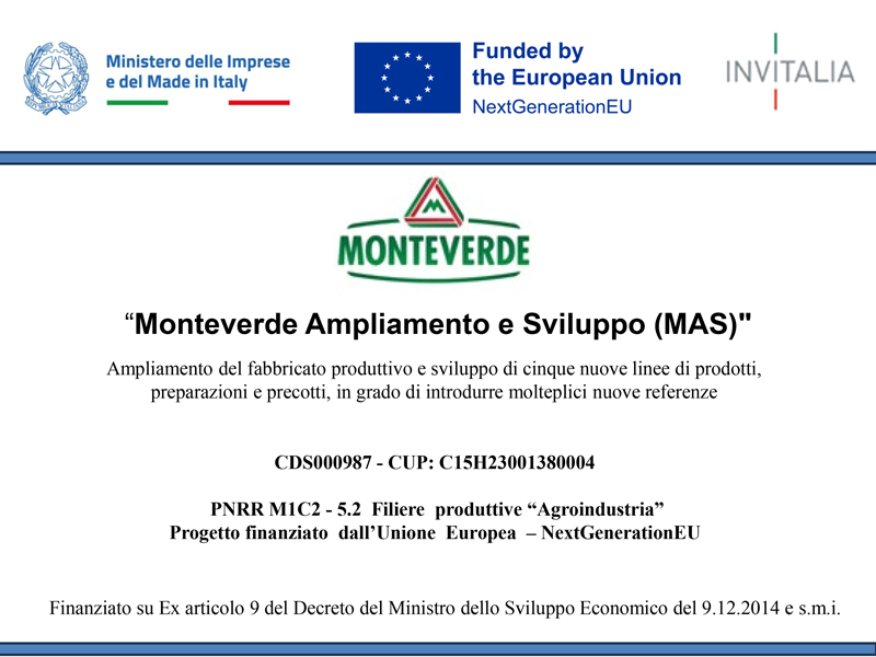 Nell’ambito dei fondi del PNRR, come Avicola Alimentare Monteverde abbiamo ottenuto un finanziamento da parte dell’unione Europea- Next Generation UE che prevede un ampliamento del sito di produzione a Rovato (BS) per un totale di 3100 m2, di cui 1600 m2 saranno destinati a locali produttivi, 250 m2 a una nuova cella di stoccaggio del prodotto congelato, 1000 m2 a magazzino e altri locali di servizio.